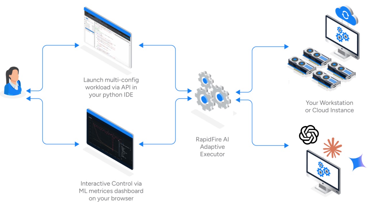 “Popular tools such as MLflow and Weights & Biases help you track or monitor experiments. Some allow you to launch configurations in a task-parallel manner, but bound by the number of GPUs you have, and stop some runs early. But RapidFire AI is the first to enable you to launch as many configurations you want in one go even on a single GPU and control them all in flight in real time. Our engine makes it seamless, maybe even enjoyable, to experiment more with configurations, instead of treating it as a chore or afterthought. Not only can you stop weak runs early, you can revisit them later, and clone and modify promising runs in flight to warm start new variants–all without extra GPUs or DevOps overhead. Such control operations can be performed interactively from the notebook or the dashboard, partially automated with bespoke scripts, or fully automated with AutoML procedures.”